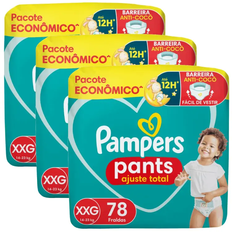 A Pampers Pants Ajuste Total é uma fralda descartável que possui cintura elástica 360º que se adapta ao corpo do bebê. É fácil de vestir e de tirar, pois funciona como uma calcinha ou cueca, sem aquelas tiras de velcro na lateral.